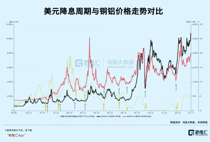 事实上,根据机构研报梳理,自1960年以来的几十年中,在货币宽松周期中,有色金属的波动与美元降息周期深度契合,每一轮利率降到周期底部之后,都基本能走出比较强势的上涨。
