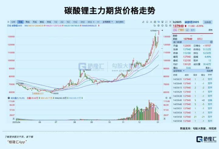 碳酸锂主力合约强势涨停8.99%,收报137940元/吨,价格重回2023年10月水平,较2025年中期已翻倍有余。