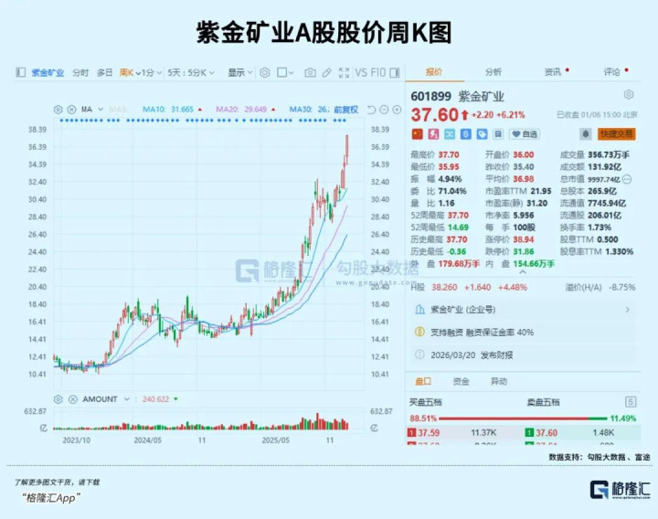 就在今天,在最近3年连续强势大涨的中国“金铜双冠王”紫金矿业今日盘中大涨6.5%,最高价保37.7元,市值一举突破1万亿元大关,成为A股第15家、有色行业中唯一一家万亿市值巨头公司。